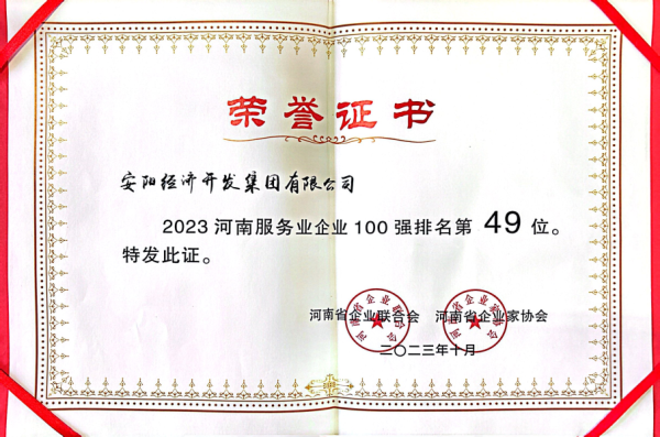 近日,集團在河南企業(yè)100強高峰會上入選“2023河南服務(wù)業(yè)企業(yè)100強”,位列榜單第49位,這是集團連續(xù)第2年獲此榮譽。