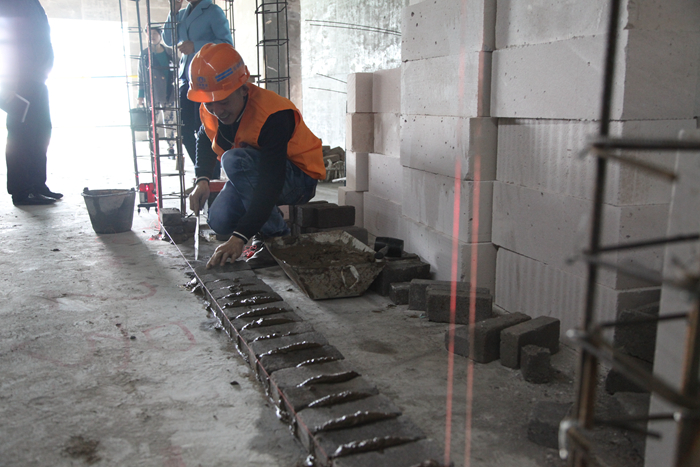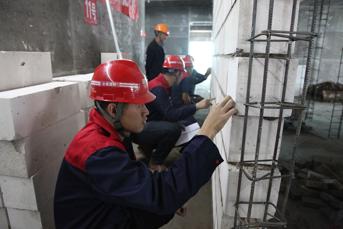 比賽當(dāng)天,在所有參賽選手進(jìn)行安全教育及競(jìng)賽相關(guān)注意事宜后,九點(diǎn)整,各參賽選手及其助手便各就各位,在海源財(cái)富中心項(xiàng)目6幢號(hào)上演了一場(chǎng)精彩的競(jìng)技PK賽,經(jīng)過(guò)1個(gè)半小時(shí)的激烈比拼,其中的12個(gè)砌磚小組在規(guī)定時(shí)間內(nèi)完成了比賽內(nèi)容。本次競(jìng)賽現(xiàn)場(chǎng)設(shè)有10名裁判進(jìn)行現(xiàn)場(chǎng)監(jiān)督,并嚴(yán)格按照砌體結(jié)構(gòu)工程施工質(zhì)量驗(yàn)收規(guī)范進(jìn)行考核,從工藝、質(zhì)量、熟練度等方面進(jìn)行綜合評(píng)比出優(yōu)勝者。