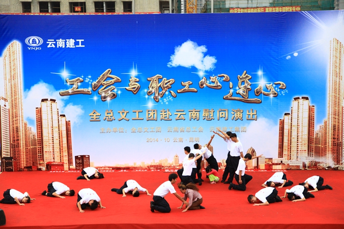 慰問演出當(dāng)天下午,天氣陰冷,但絲毫不影響演員們的熱情,在《兄弟干杯》、《愛的奉獻(xiàn)》、《誰說女子不如男》等幾首歌唱過后,現(xiàn)場的氣氛逐漸升溫,激情歌手大鵬的《向天再借五百年》、《老婆你真不容易》進(jìn)一步釋放了觀眾的熱情,現(xiàn)場氣氛好不熱烈。隨后,公司音詩畫節(jié)目《決戰(zhàn)魯?shù)?感恩大愛》登臺上演,以旁白,舞蹈,對白等多種形式重現(xiàn)了抗震救災(zāi)、后勤保障、愛心捐款、愛心獻(xiàn)血等過程中的真人真事,動人瞬間,讓現(xiàn)場觀眾們?nèi)谌牍适虑楣?jié)當(dāng)中,深受感動,齊聲為云南建工拍手叫好。