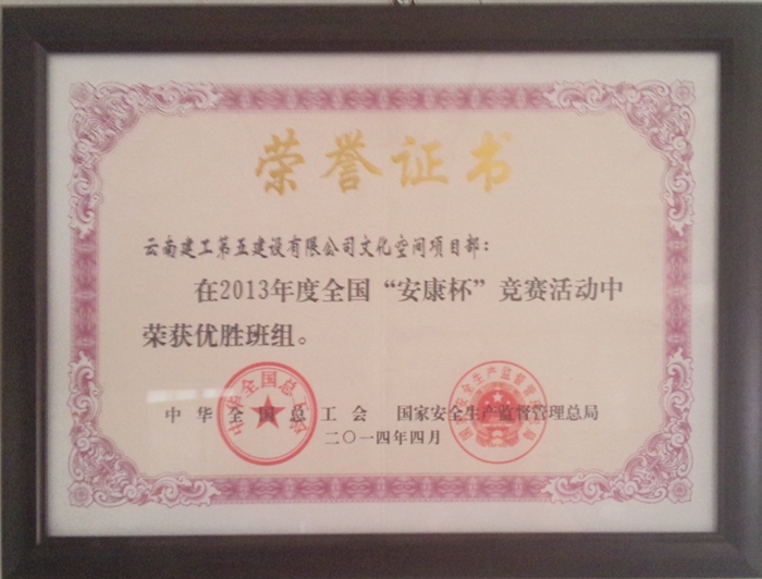 技術(shù)支持: 方森科技 6月18日,中華全國總工會和國家安全生產(chǎn)監(jiān)督管理總局聯(lián)合在北京召開2013年度全國“安康杯”競賽表彰暨經(jīng)驗交流電視電話會議,會上,中華全國總工會、國家安全生產(chǎn)監(jiān)督管理總局發(fā)布總工發(fā)〔2014〕19號《關(guān)于表彰2013年度全國“安康杯”競賽先進(jìn)集體和優(yōu)秀個人的決定》,公司第四直管項目部文化空間項目部榮獲2013年度“全國安康杯競賽優(yōu)勝班組”稱號。