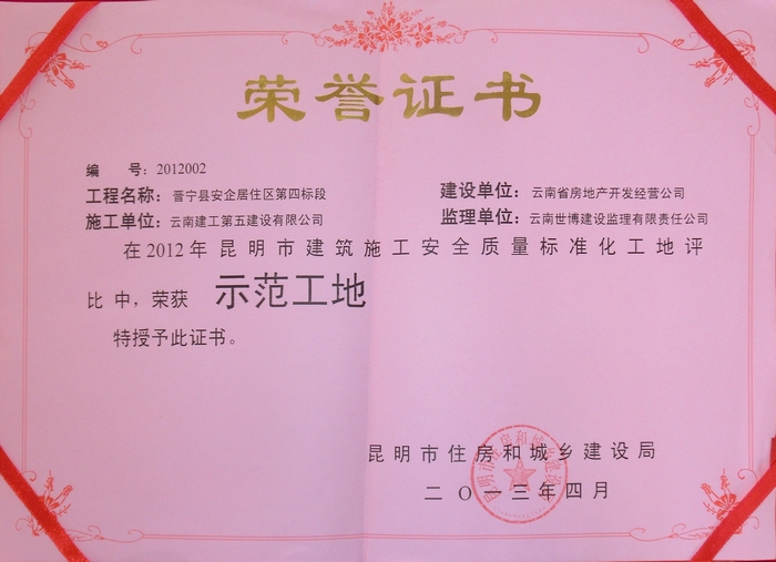 技術(shù)支持: 方森科技 近日,公司五〇三直管項(xiàng)目部承建的晉寧縣安企居住區(qū)第四標(biāo)段工程被云南建工集團(tuán)有限公司授予二〇一二年度“安全質(zhì)量標(biāo)準(zhǔn)化十佳工地”榮譽(yù)證書,另外,該工程在2012年昆明市建筑施工安全質(zhì)量標(biāo)準(zhǔn)化工地評比中,還被昆明市住房和城鄉(xiāng)建設(shè)局授予“示范工地”獎(jiǎng)牌和榮譽(yù)證書。