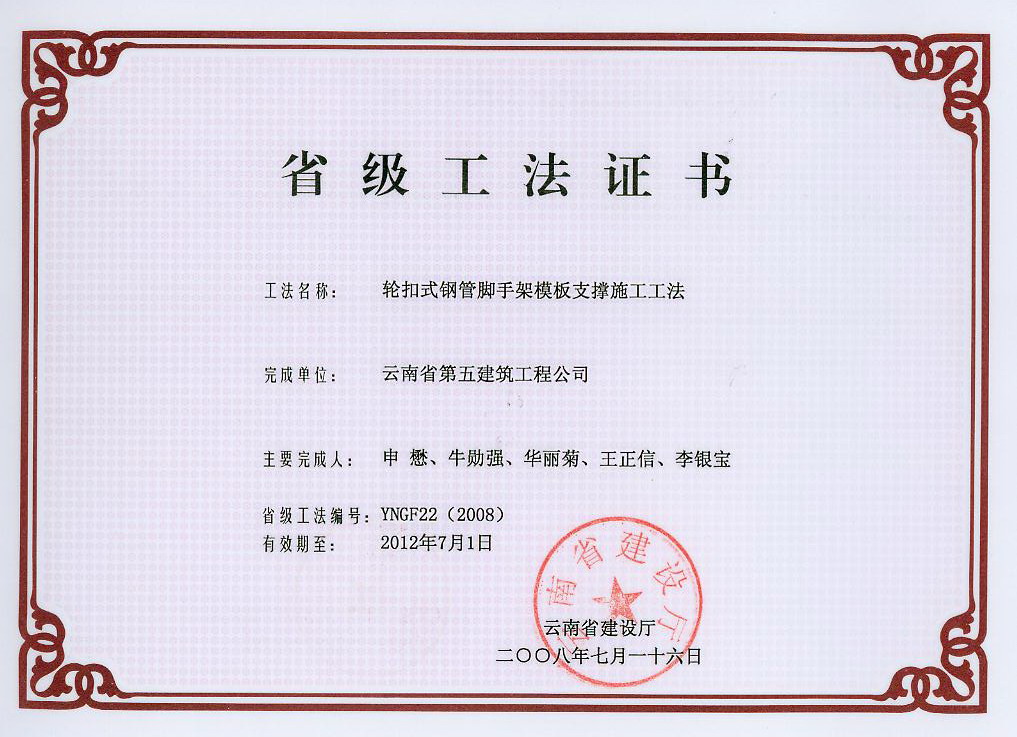 云南五建編制的省級(jí)工法——輪扣式多功能腳手架模板支架的應(yīng)用工法