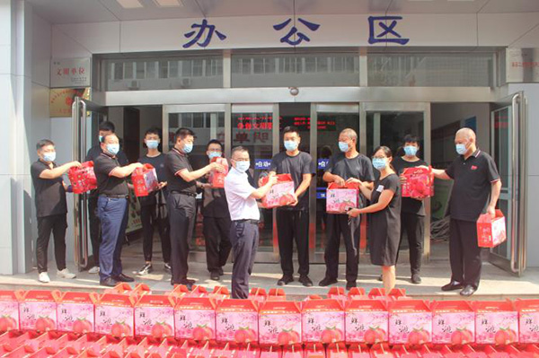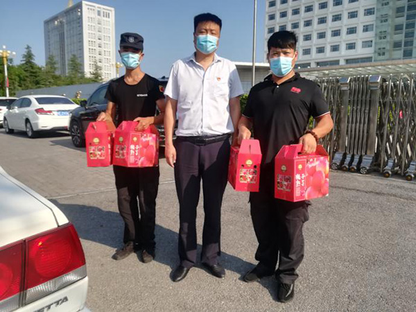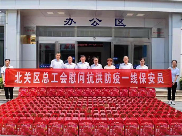8月9日、10日北關區(qū)總工會副主席薛梅、保障部部長司尚雯來到安陽市洹河保安服務有限責任公司,送來抗洪防疫慰問品鮮桃500多箱,向堅守崗位、奮戰(zhàn)一線的保安隊員進行慰問,提醒大家做好防控工作的同時一定要做好自身防護。