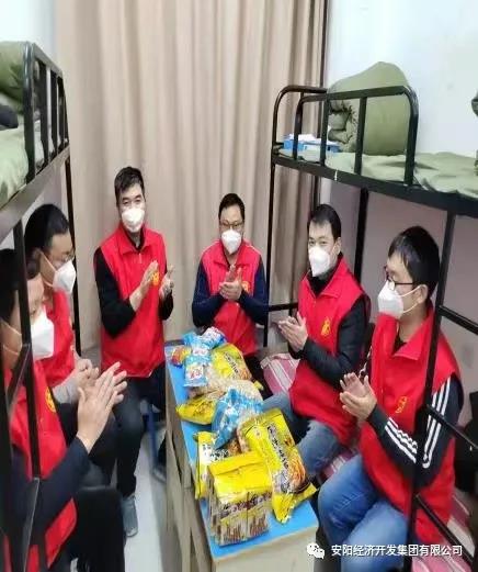 1月25日,是經(jīng)開集團志愿者秦勝攀34歲的生日。在晝錦中學隔離點,他向往常一樣重復著為隔離人員配送生活物資、清理垃圾、環(huán)境消殺等工作。下班后在宿舍出現(xiàn)了暖心的一幕:在這個特殊的時期、特殊的地方、特殊的環(huán)境,沒有蠟燭、沒有蛋糕,但有特殊的“家人”陪他一起過生日。“家人”們紛紛表示愛心,送上了溫暖的祝福。